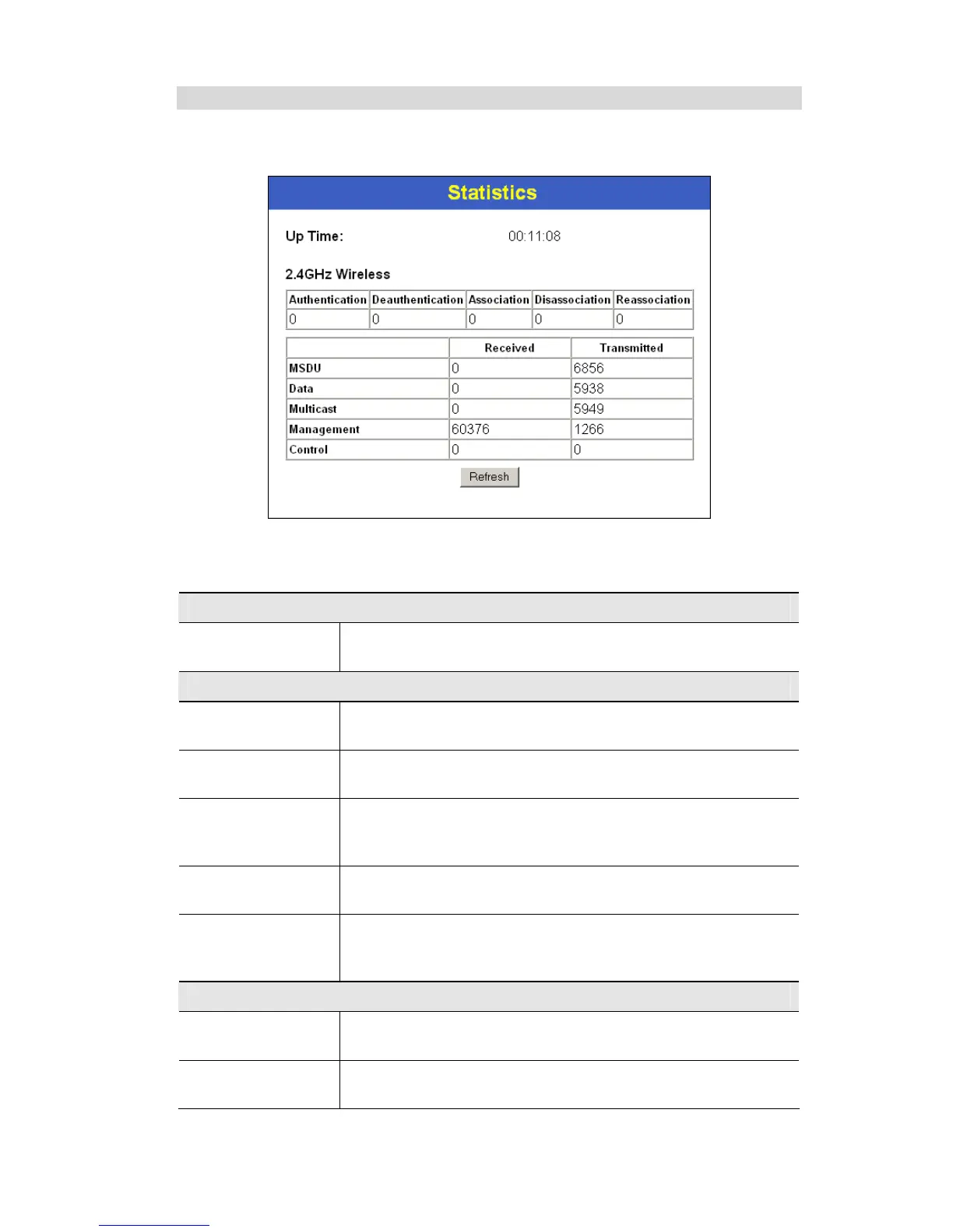 This screen is displayed when the 2.4GHz Statistics button on the Status screen is clicked. It