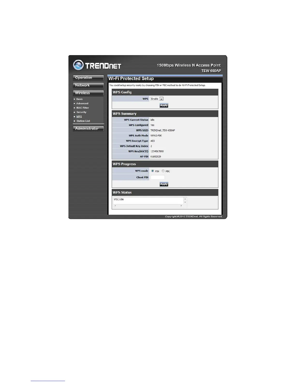 Two WPS modes can be selected – PIN & PBC. If PIN is selected, you should enter PIN code of your