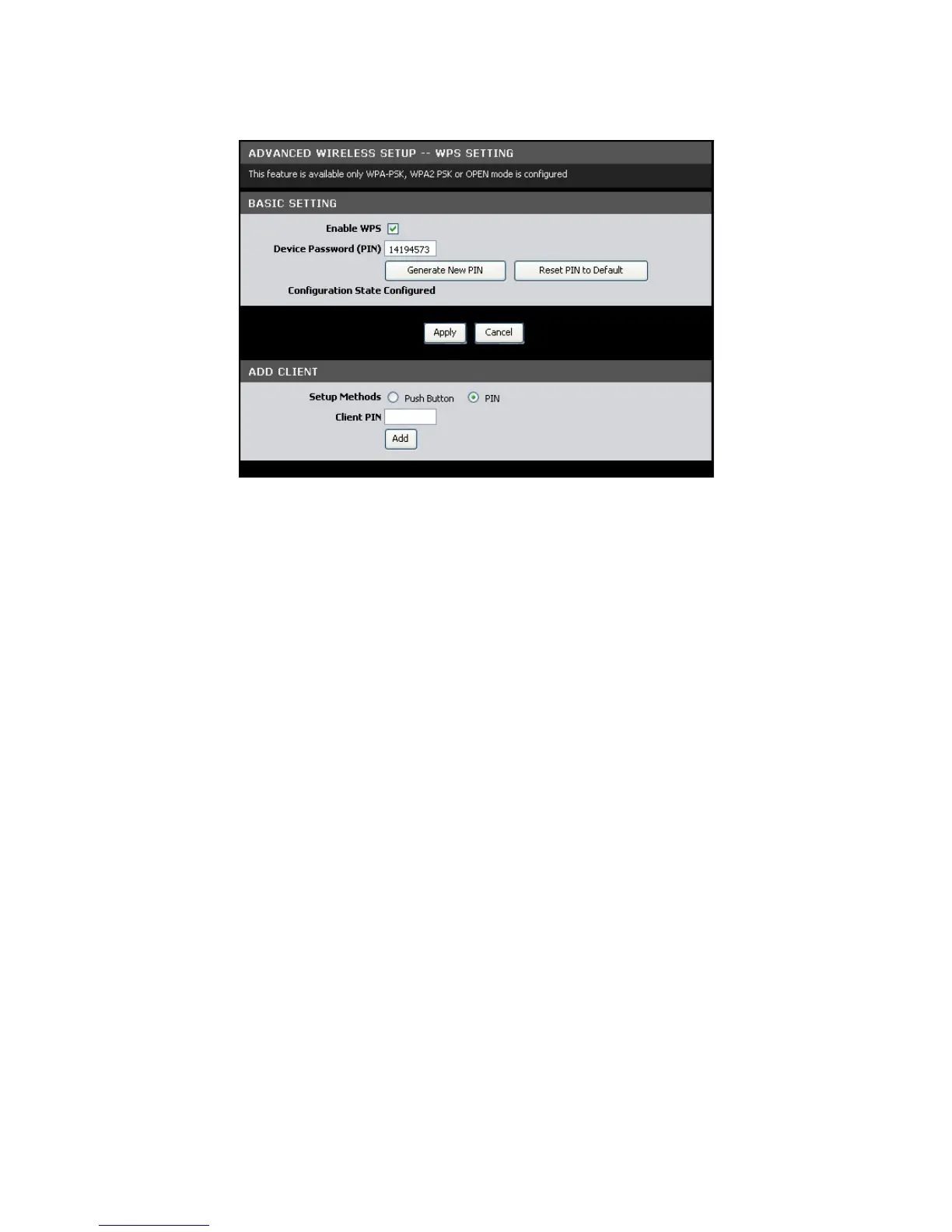 • Client PIN: Enter the WPS-supported device’s PIN. This PIN is used to
