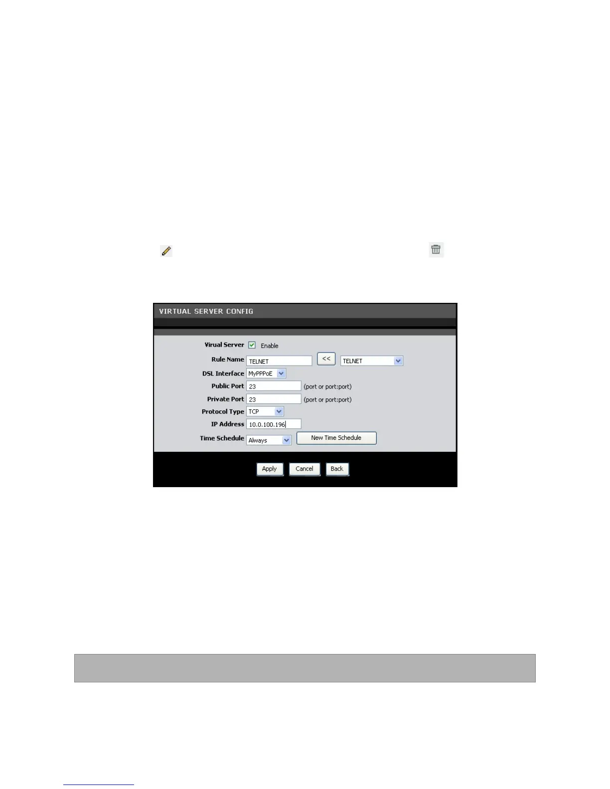 To add virtual servers, click the Add button. The Virtual Server Config screen is