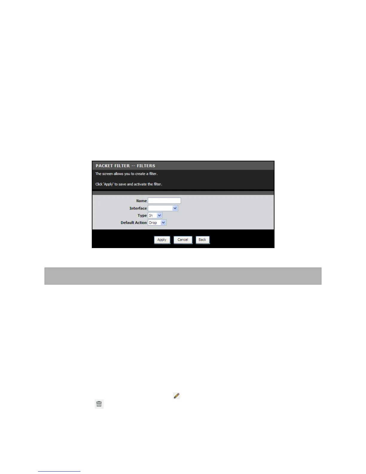This page allows you to create packet filters and rules. These filters are used to