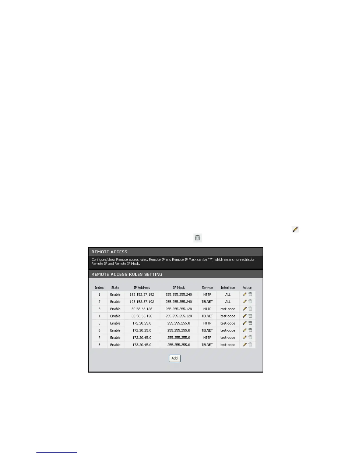 The table lists the remote access rules. To edit an entry, click the corresponding