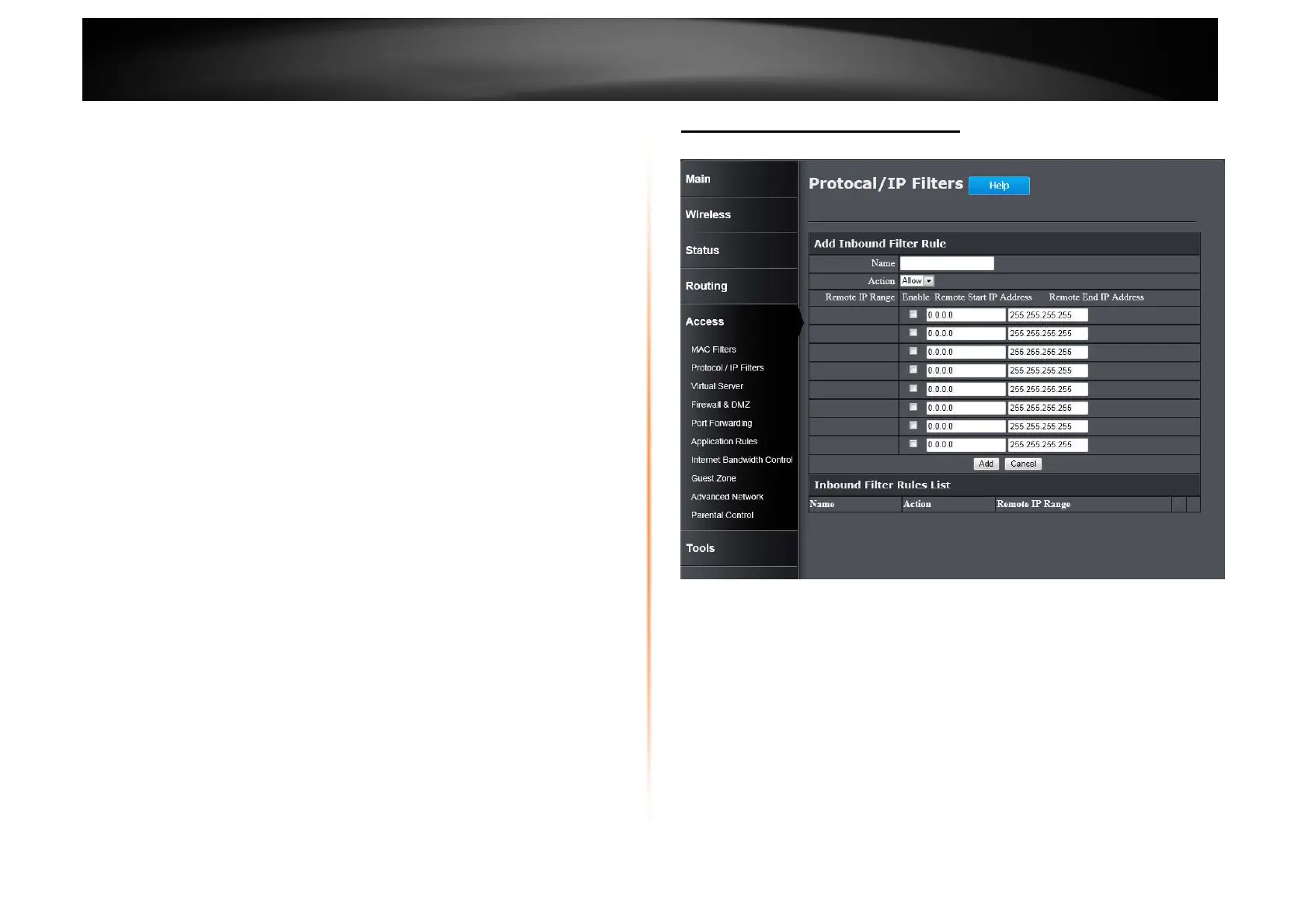 This section displays a list of configured inbound filter rules.