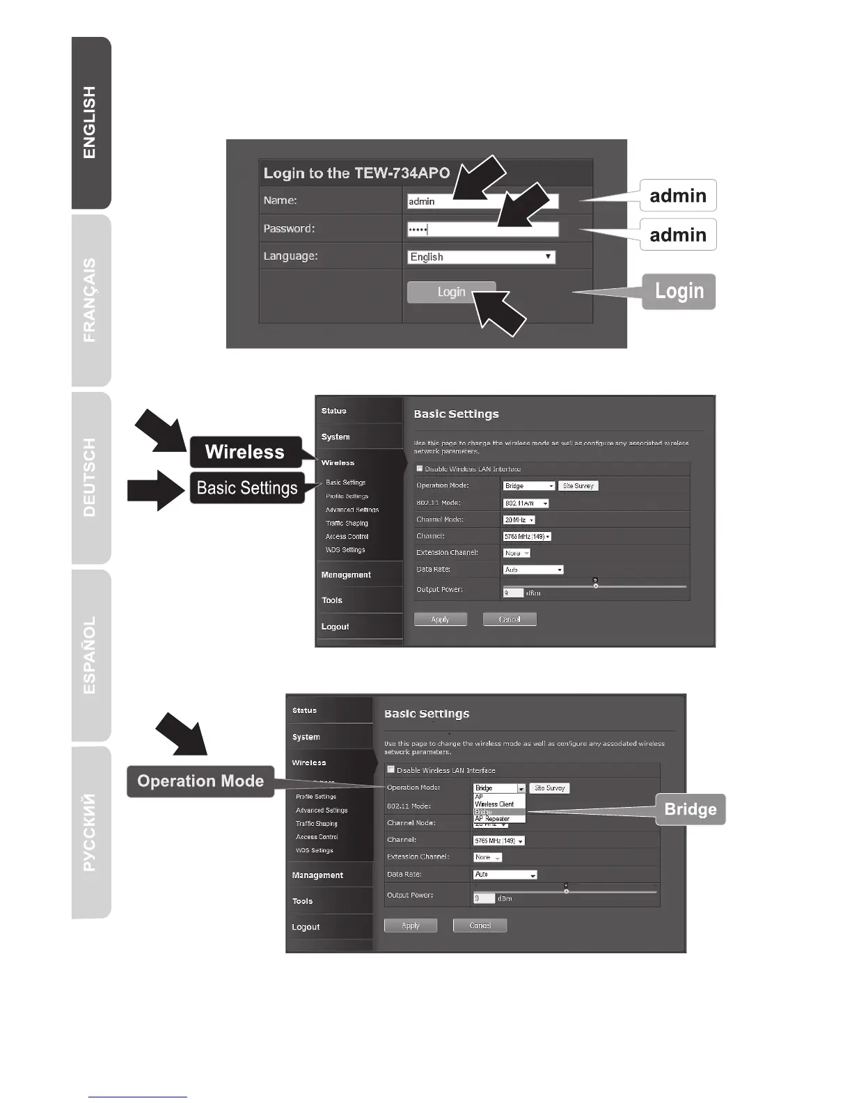 TRENDnet TEW-734APO - TEW-734 APO Configuration: Login and Settings; Login and Basic Settings Access; Setting Operation Mode to Bridge