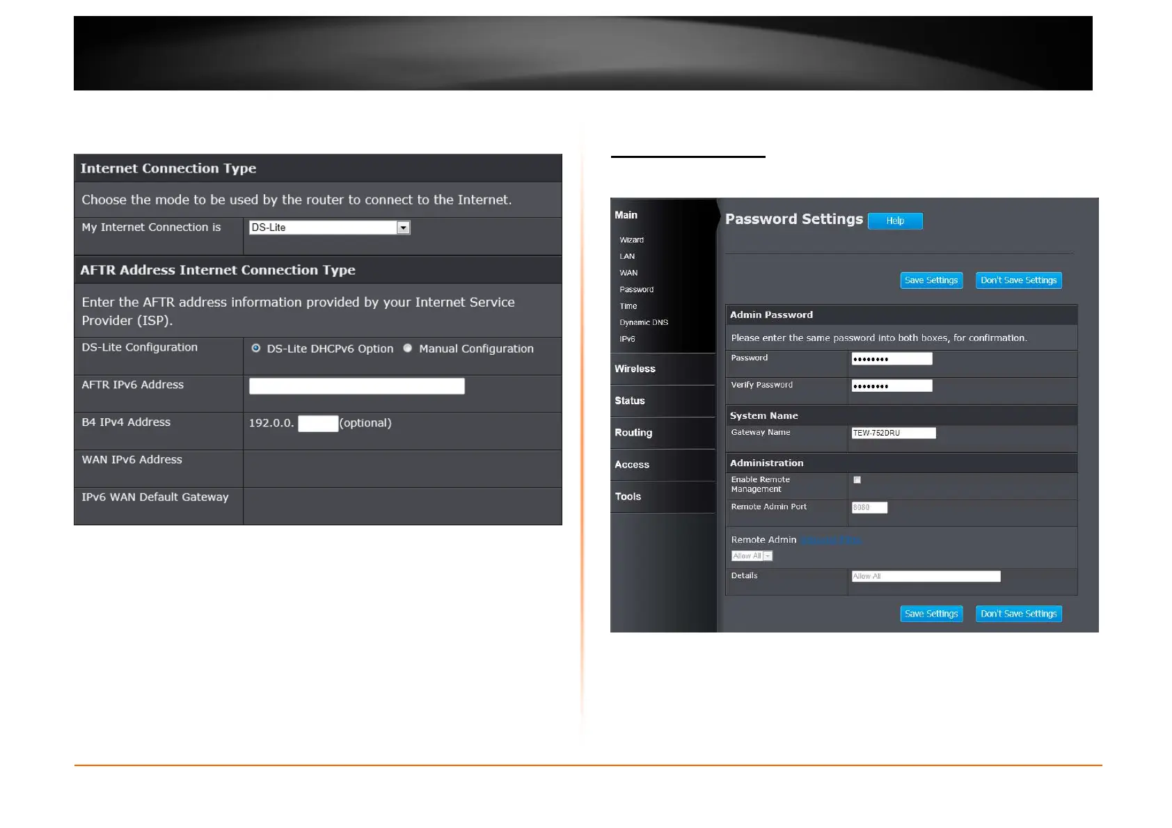 AFTR IPv6 Address: When Manual Configuration is selected in DS-Lite