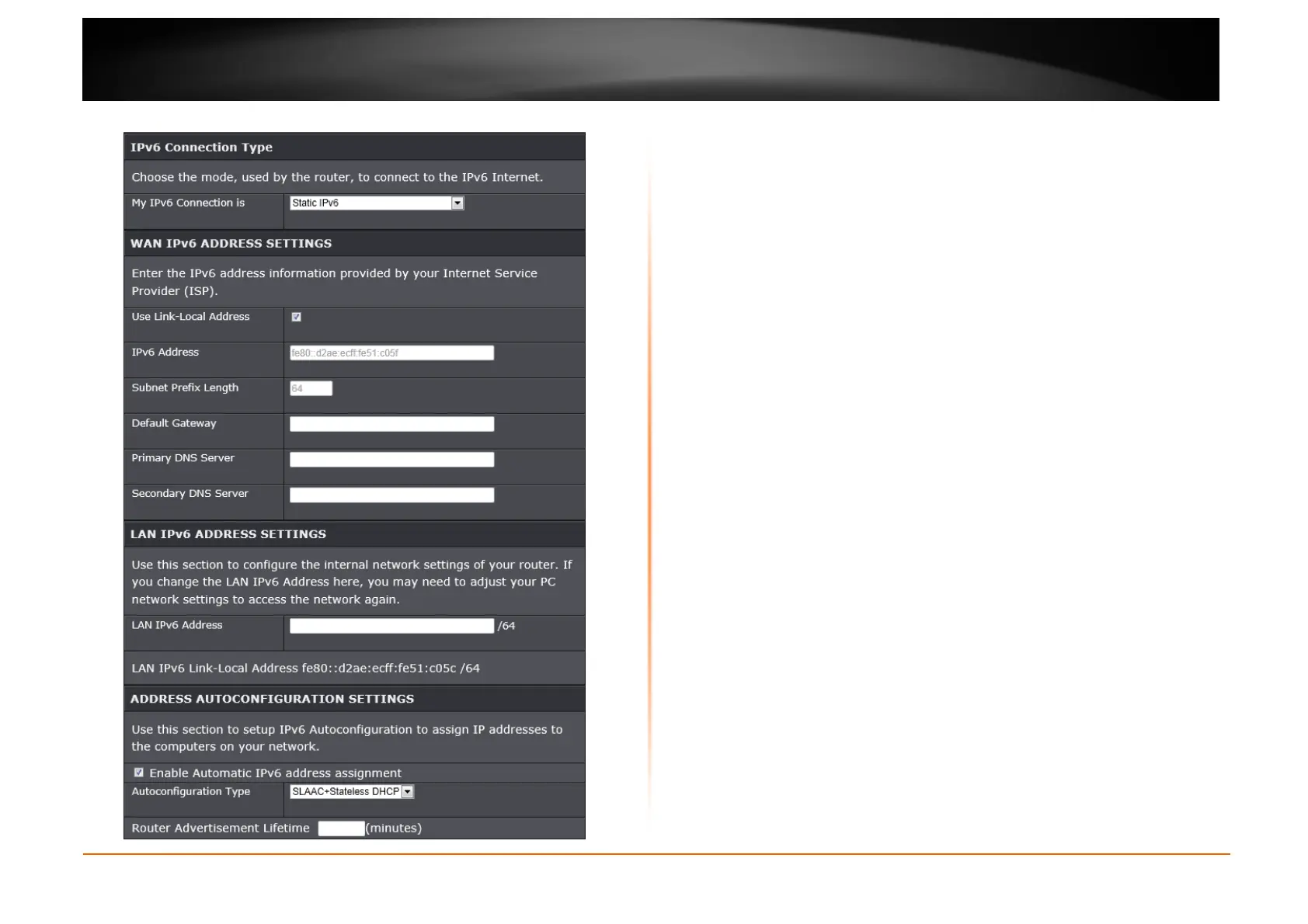 LAN IPv6 Link-local Address: This field displays the LAN IPv6 link-local