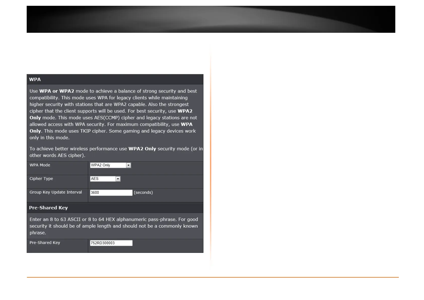 Pre-shared Key: Enter the WPA-Personal wireless Pre-Shared Key (Wi-Fi Key)