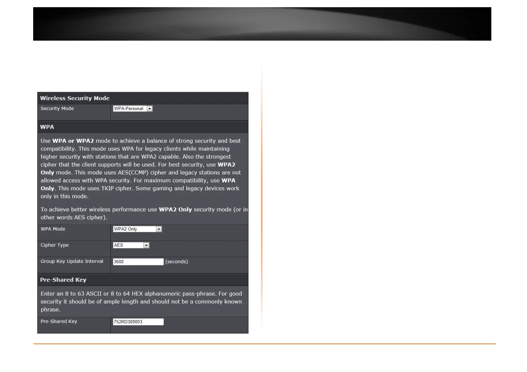 Pre-shared Key: Enter the WPA-Personal wireless Pre-Shared Key (Wi-Fi Key)