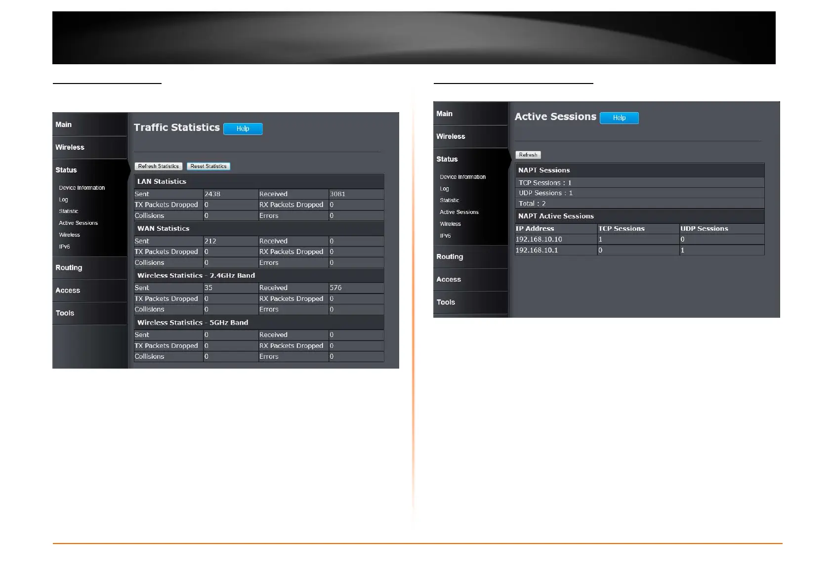 This window displays the LAN, WAN and Wireless interface statistics for the