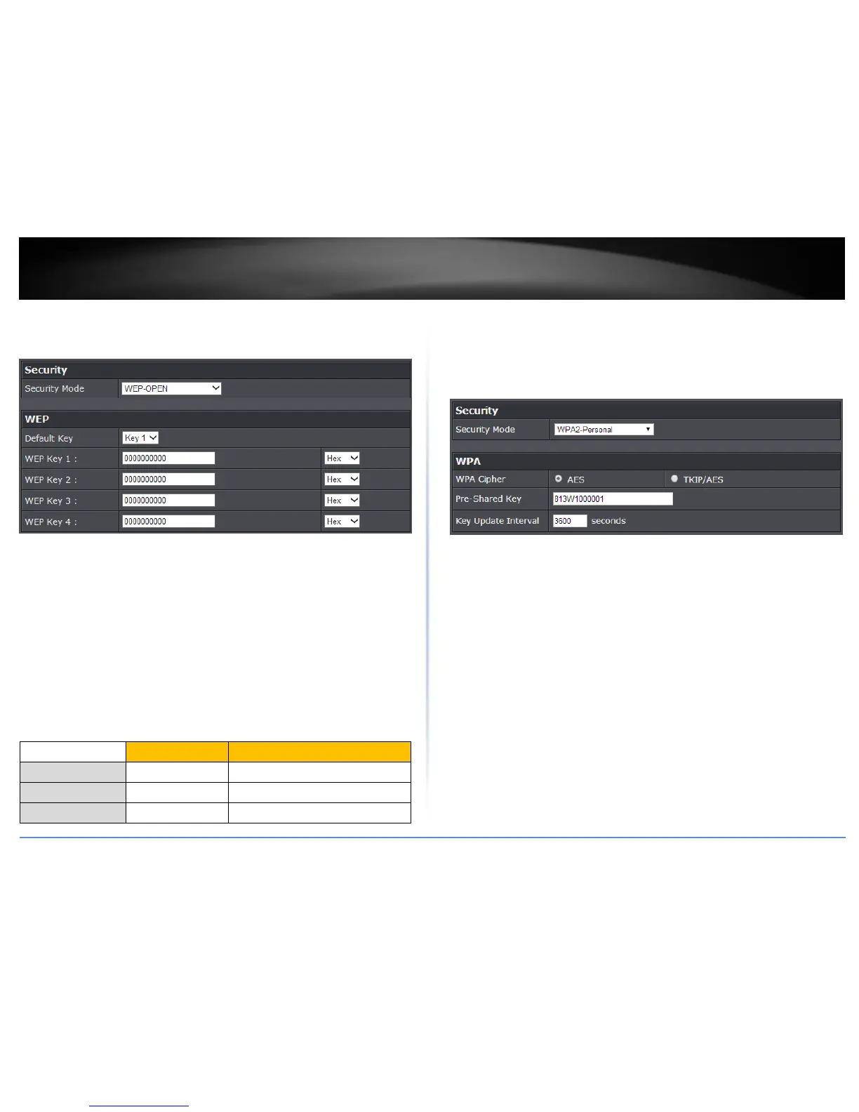 Hex/ASCII: Enter the WEP key format. See the table below for the acceptable