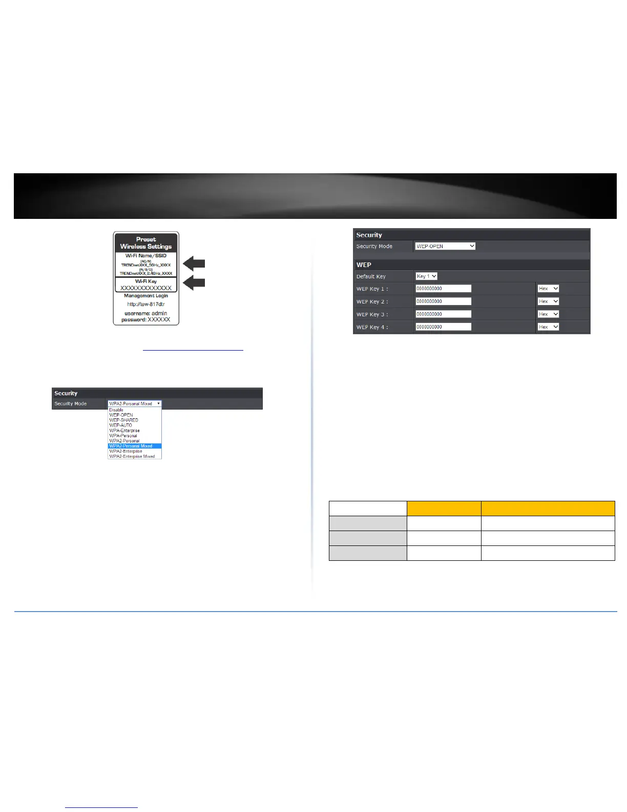 Hex/ASCII: Enter the WEP key format. See the table below for the acceptable