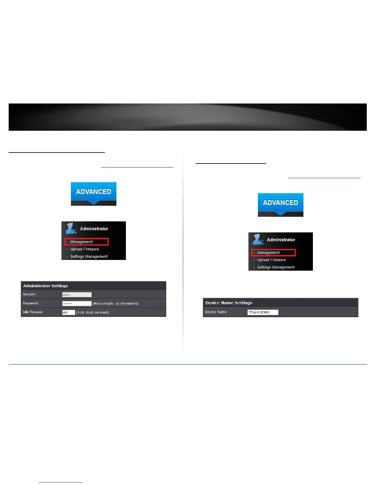 management page using the User Name “admin” and the new password instead of
