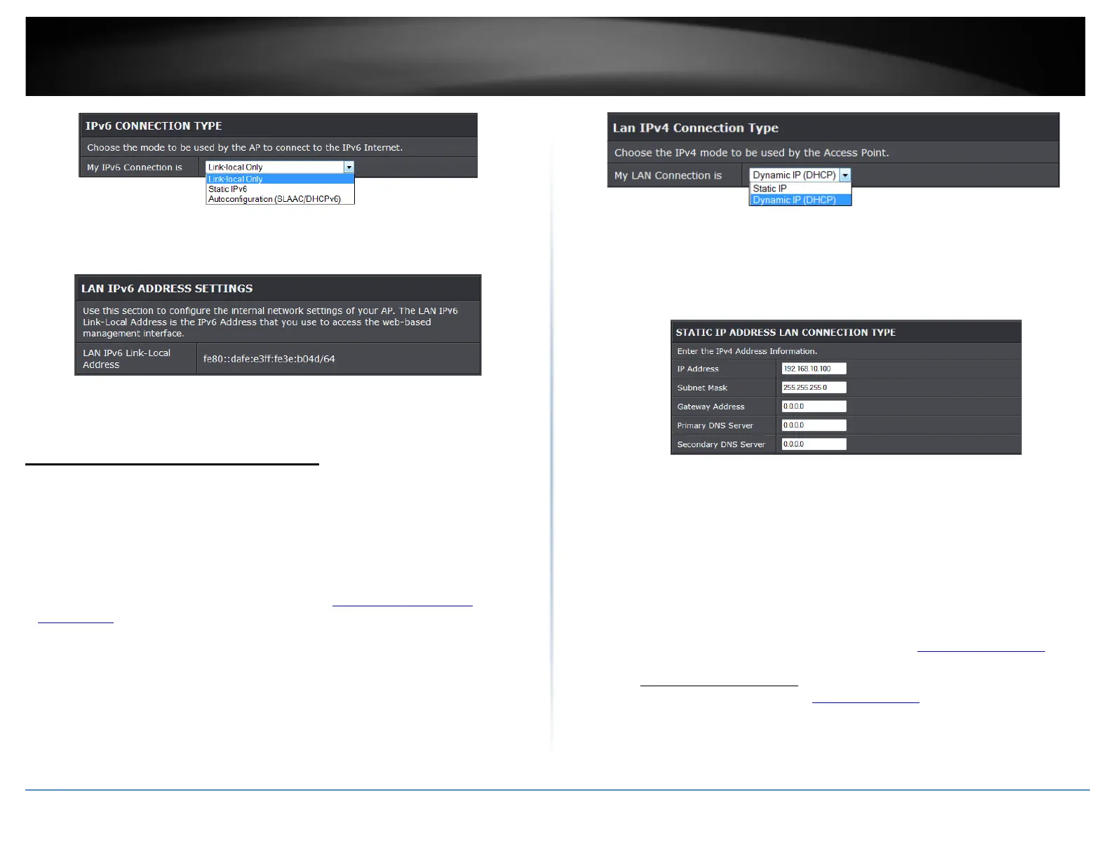 • LAN IPv6 Link-Local Address: Current IPv6 address applied to your access point.
