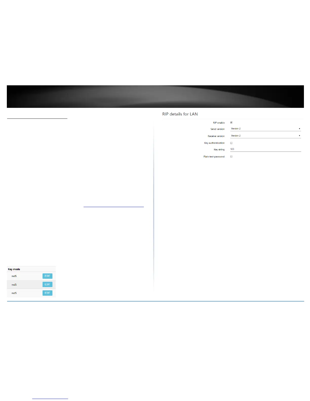 Authentication – Enables MD5 authentication on all RIP messages sent and