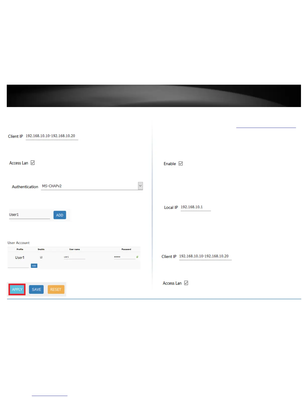 5. In the Client IP field, enter an IP address range (within the same LAN IP subnet range)