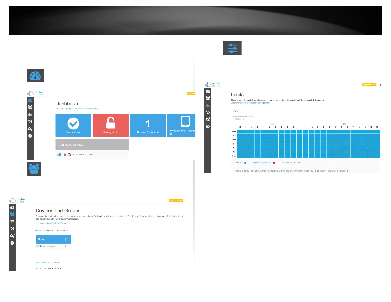 • Limits – Content filtering rules and scheduling are configured on this
