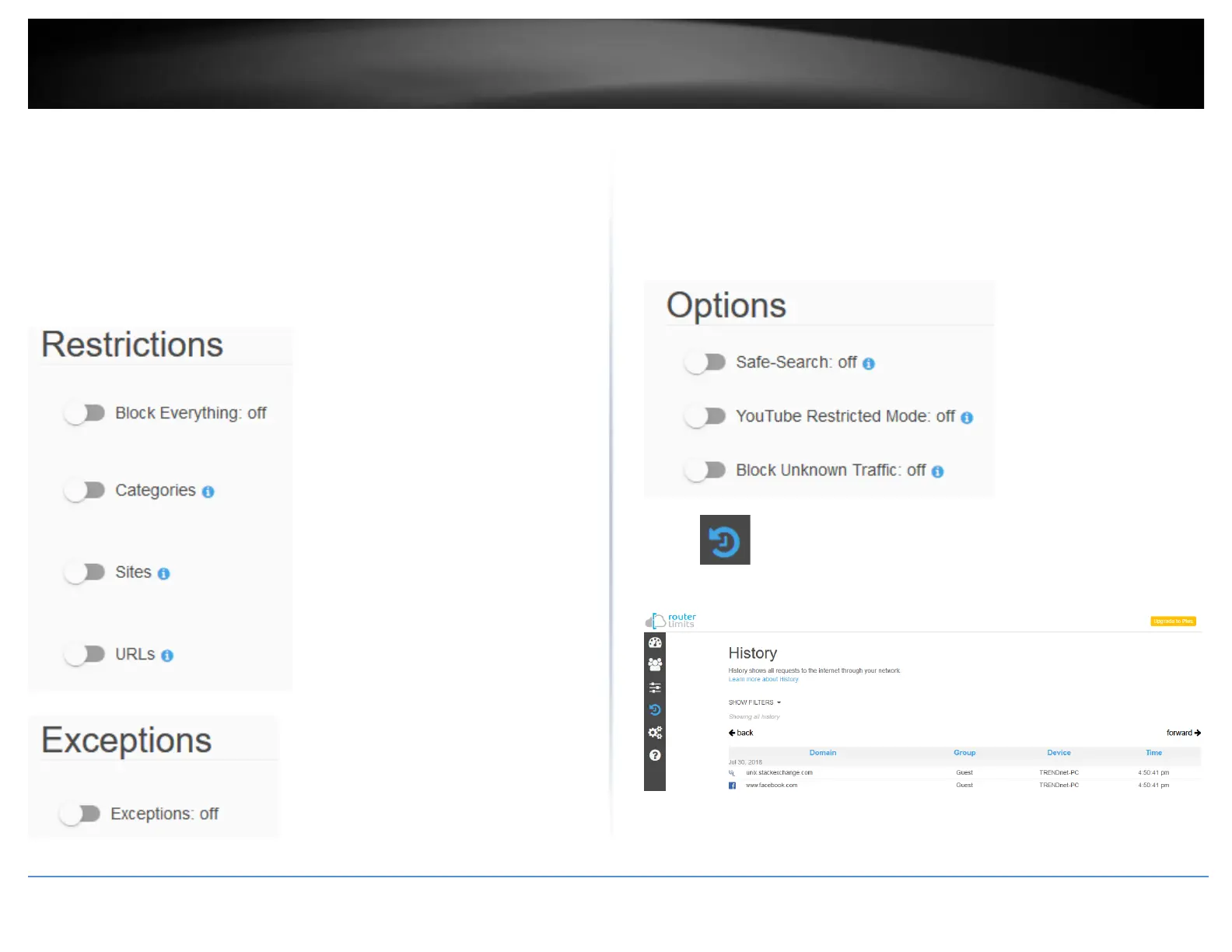 • History – This page will display the Internet access history through
