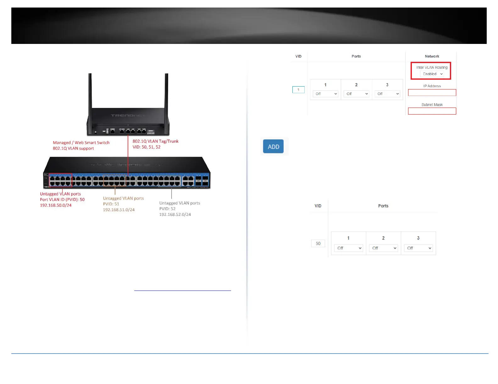Example: In the example below, we will enter the VLAN 50 interface IP address as