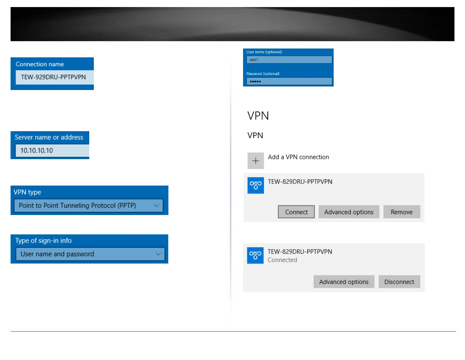 12. The status will display Connected if the PPTP VPN connection was successful.
