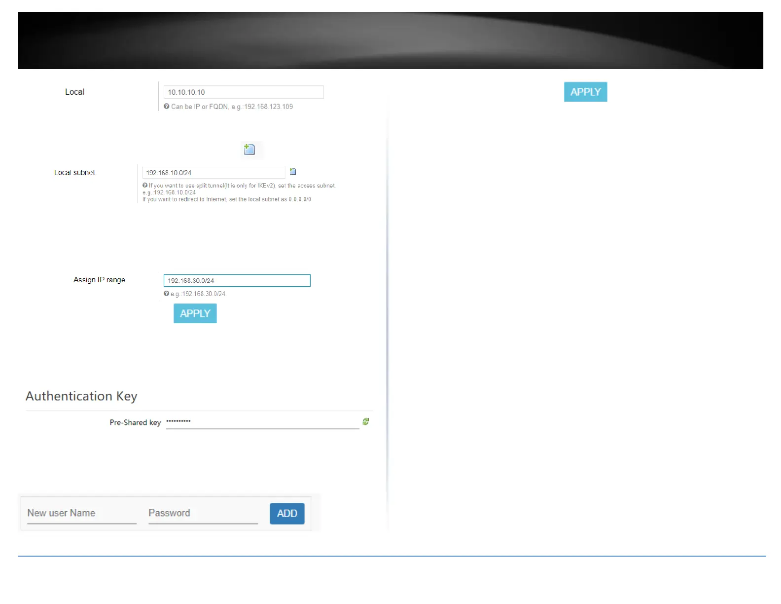 9. Under Authentication Key, enter the Pre-Shared Key (PSK) for the IPsec VPN tunnel.