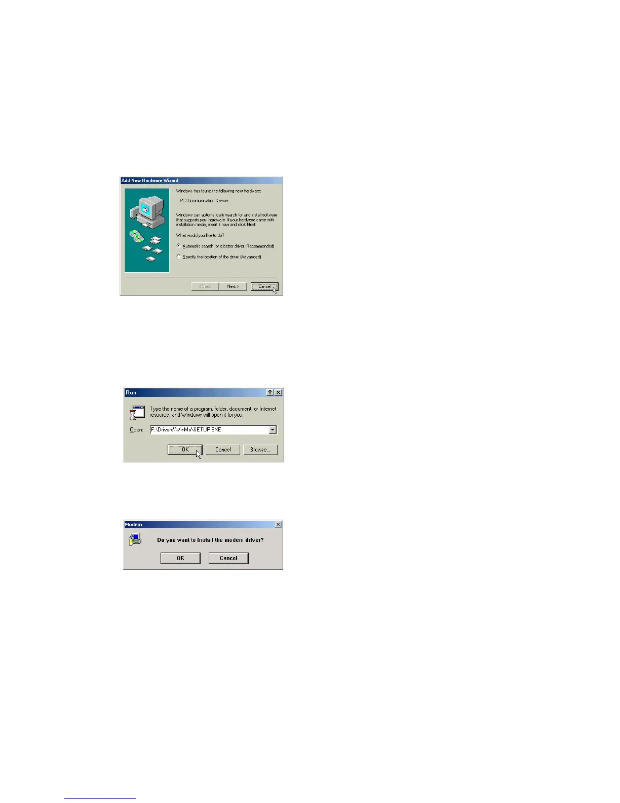 then run <CD-ROM letter>:\drivers\WinMe\SETUP.EXE to upgrade the modem driver as shown