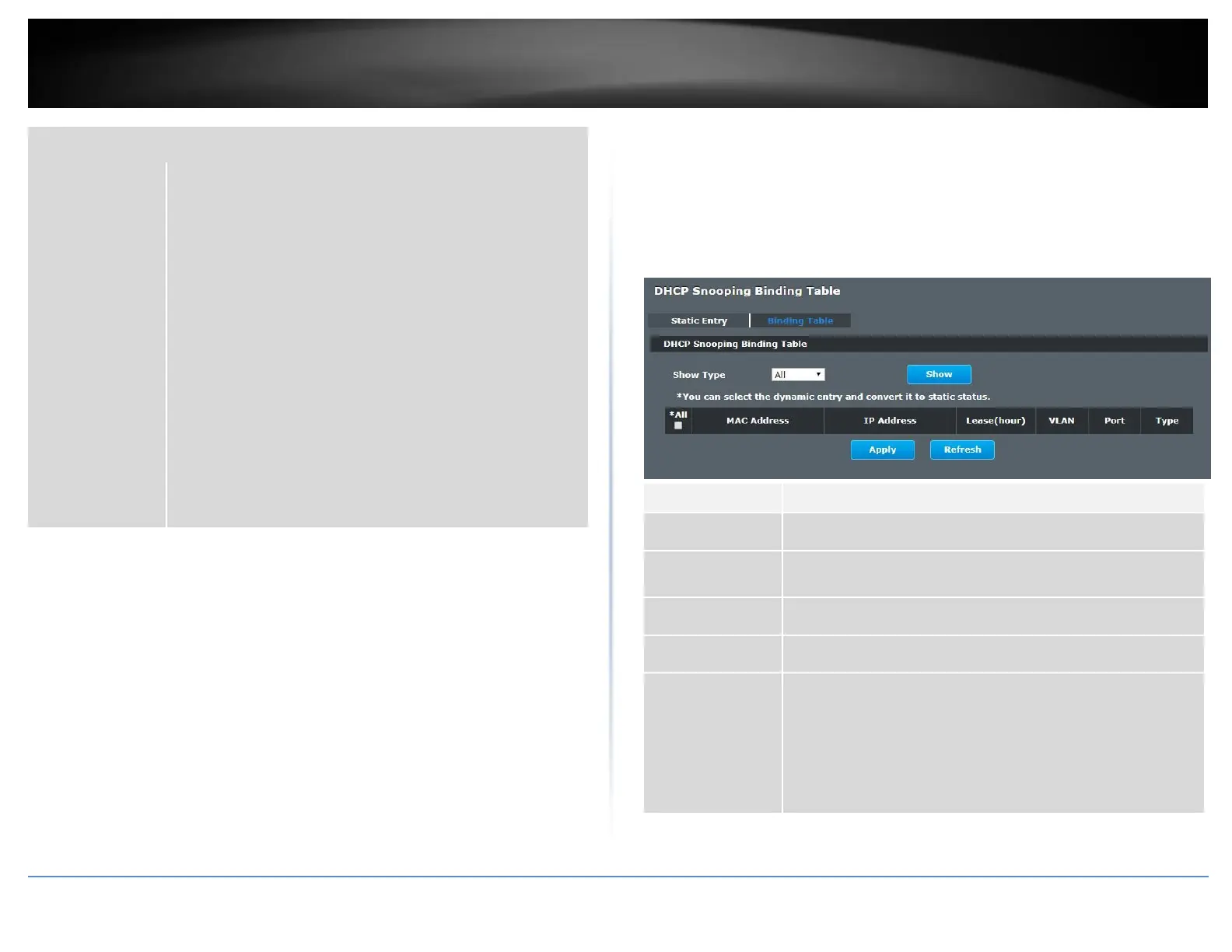 Security > IP Source Guard > Binding Table > Binding Table