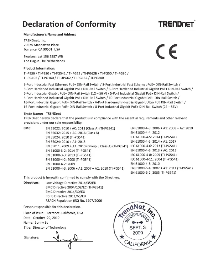 TRENDnet TI-PG80 - Declaration of Conformity; Manufacturer and Product Details; Regulatory Compliance