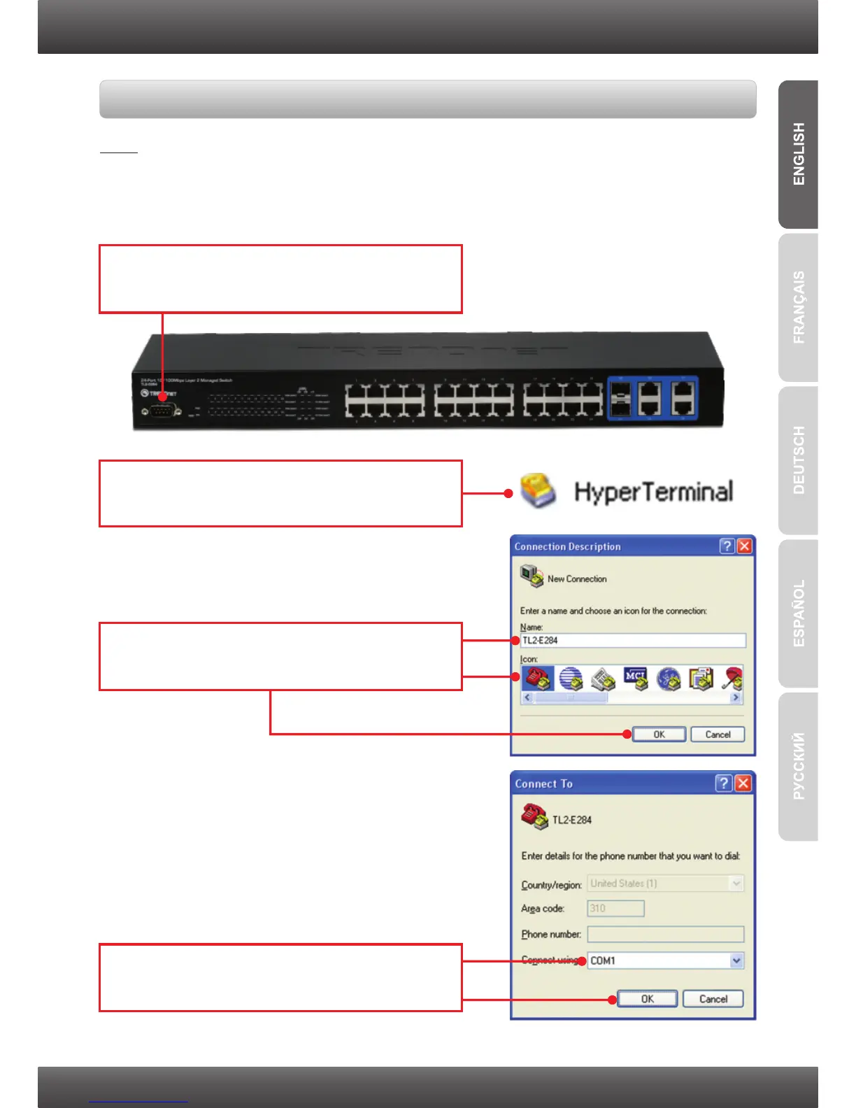 A terminal program such as HyperTerminal is required to configure the switch via the Console Port.