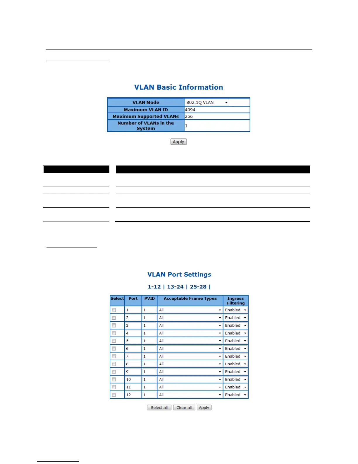 TRENDnet TL2-E284 - Vlan; VLAN Basic Information; VLAN Port Settings