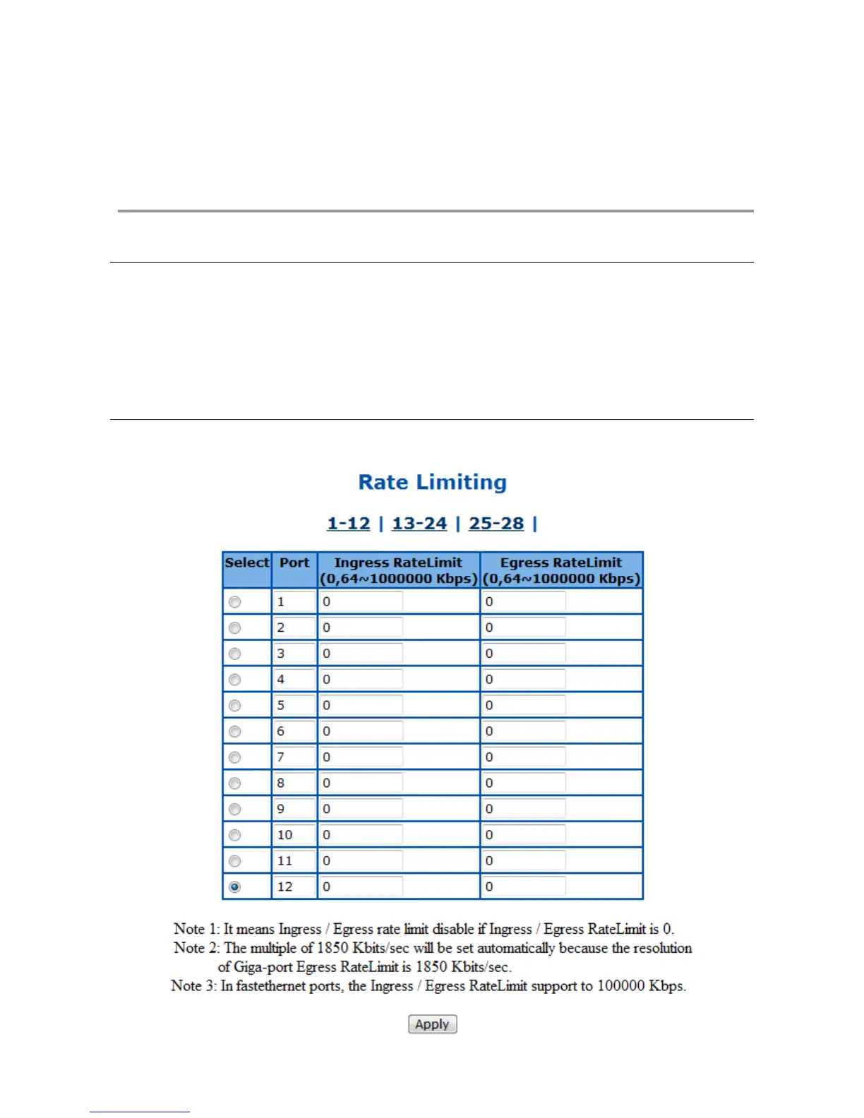 This page is to configure the rate limiting function on each port.