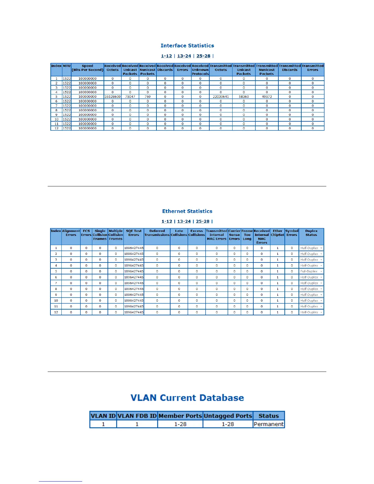 Click 1-12, 13-24, 25-28 to display the Ethernet related statistics of corresponding ports.