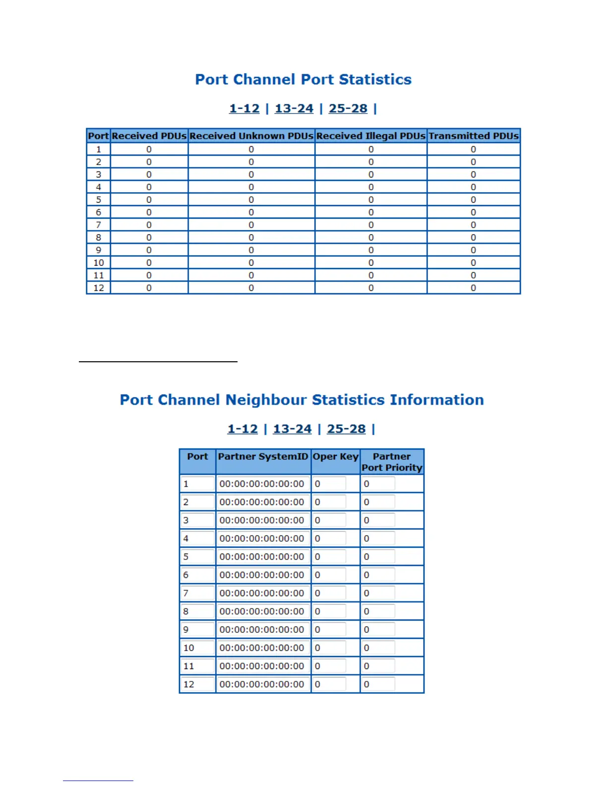 Click 1-12, 13-24, 25-28 to display the Link Aggregation neighbours information of corresponding ports.