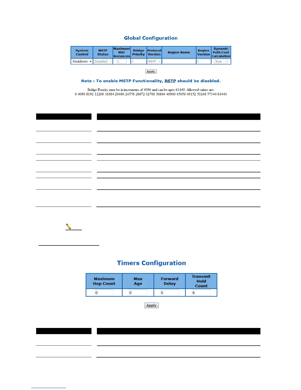 This page is to configure the MSTP timers of the Switch.