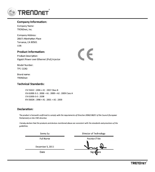 TRENDnet TPE-113GI - Product Information and Compliance; Company and Product Details; Technical Standards Compliance; Declaration of Conformity