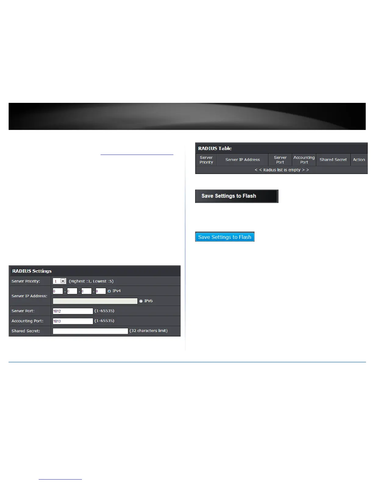 • Server IP Address –Select IPv4 or IPv6 and set the RADIUS server IP address