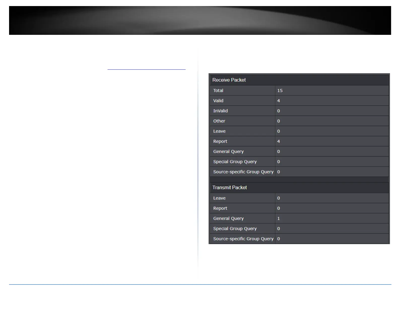 o Leave: Displays the total of IGMP leave packets transmitted by the