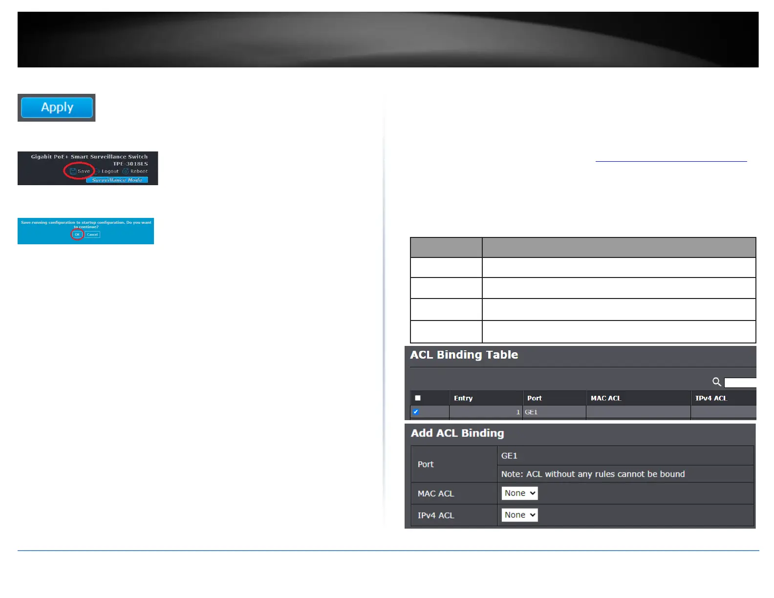 This section allows users to bind MAC or IPv4 ACLs to specific switch ports or link