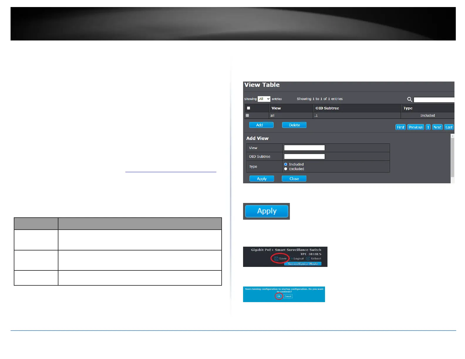 The SNMP View table specifies the MIB object access criteria for each View Name. If the