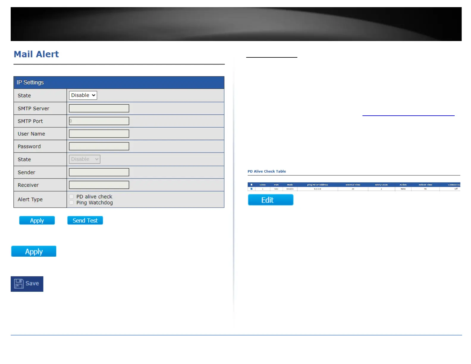 4. Check the Enable option for Status to enable PD alive check on the selected port.