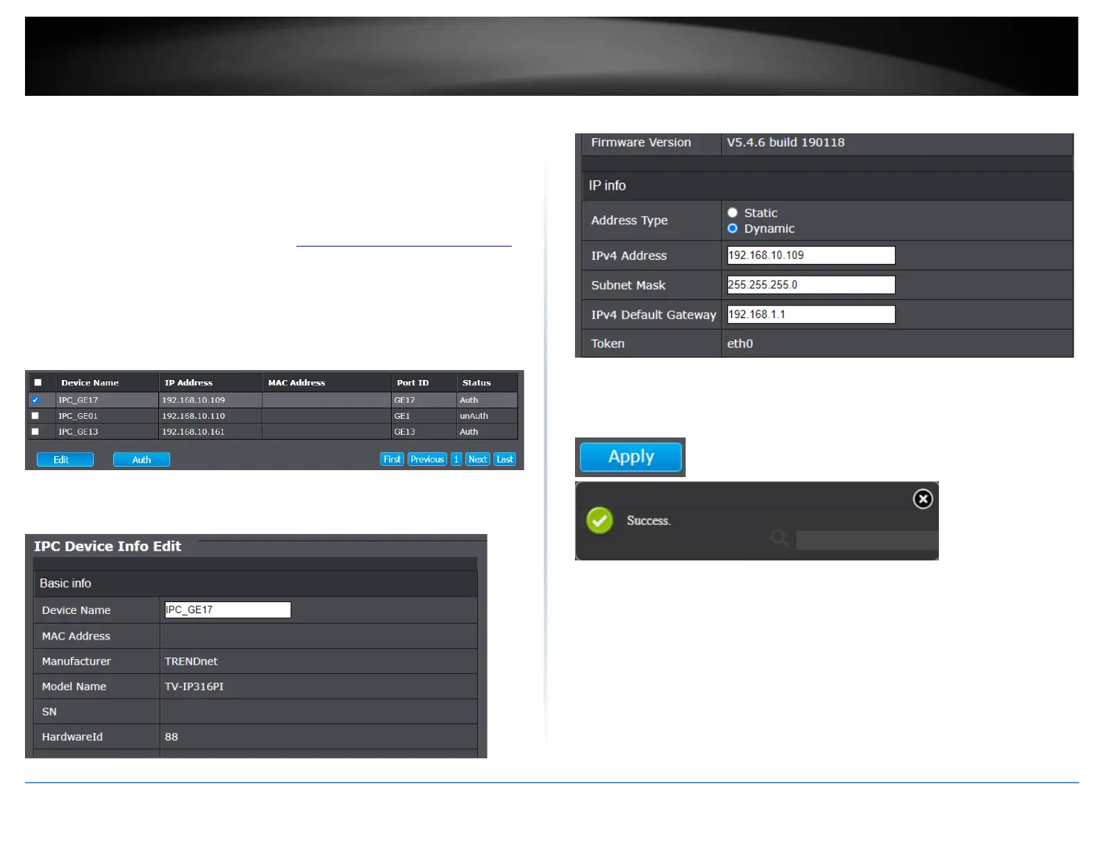 5. Scroll down the window to view or modify the device IP address configuration.