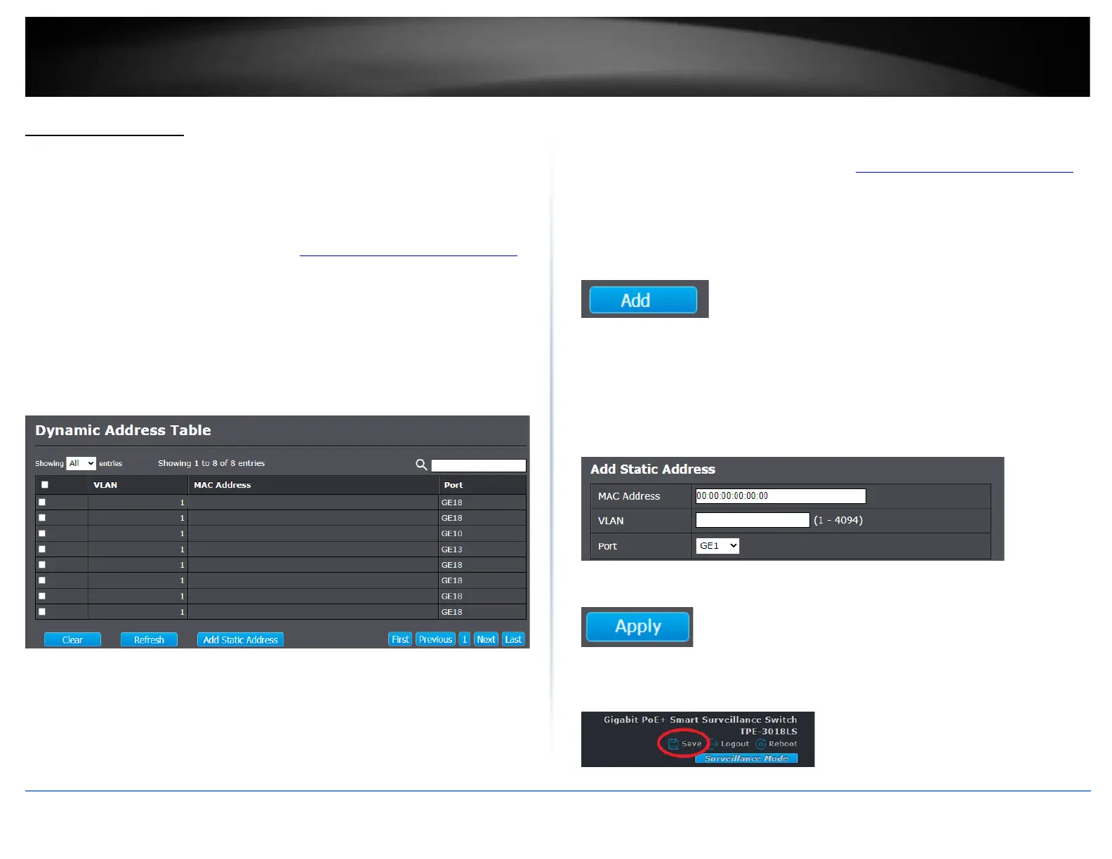 the MAC address table by clicking Clear or you can add one of the learned MAC