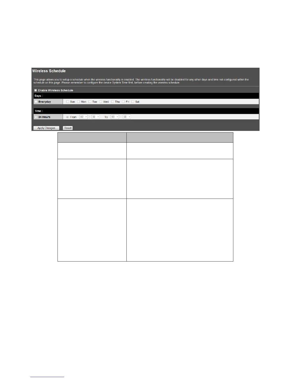 This page allows you to setup a schedule when the wireless functionality is enabled. The wireless