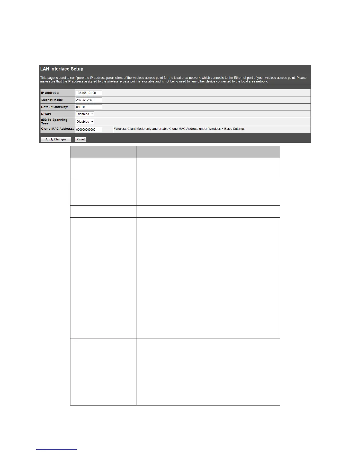 *Please click on the Apply Changes button or the Reset button at the bottom to save/reset the configu-