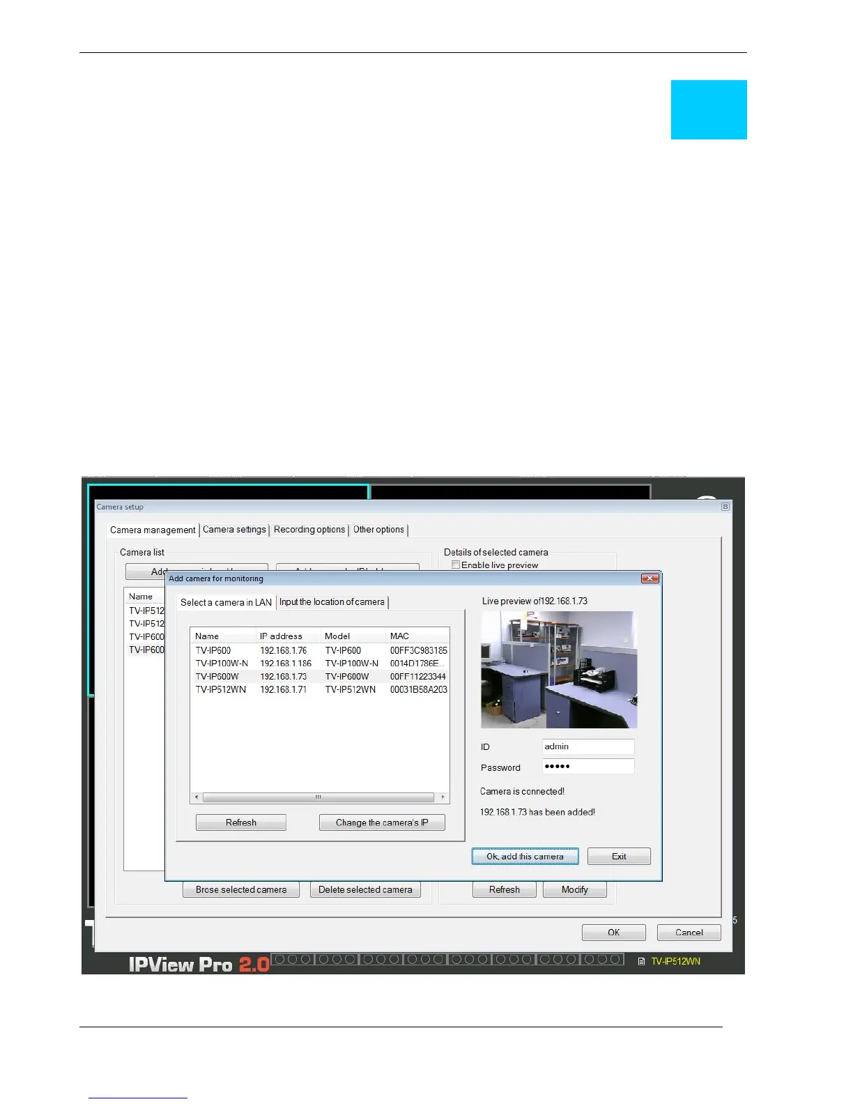 This section describes the how to setup a camera using the IPView Pro 2.0 camera monitoring