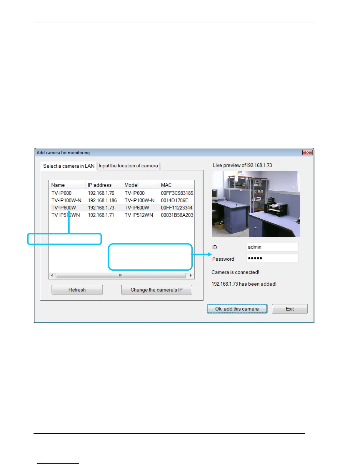 2. Select the camera to add from the list, enter the administrator’s user name (ID:) and password, a
