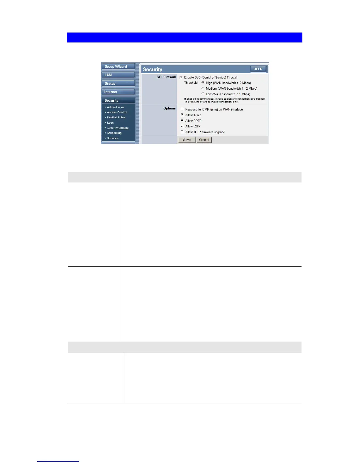This screen allows you to set Firewall and other security-related options.