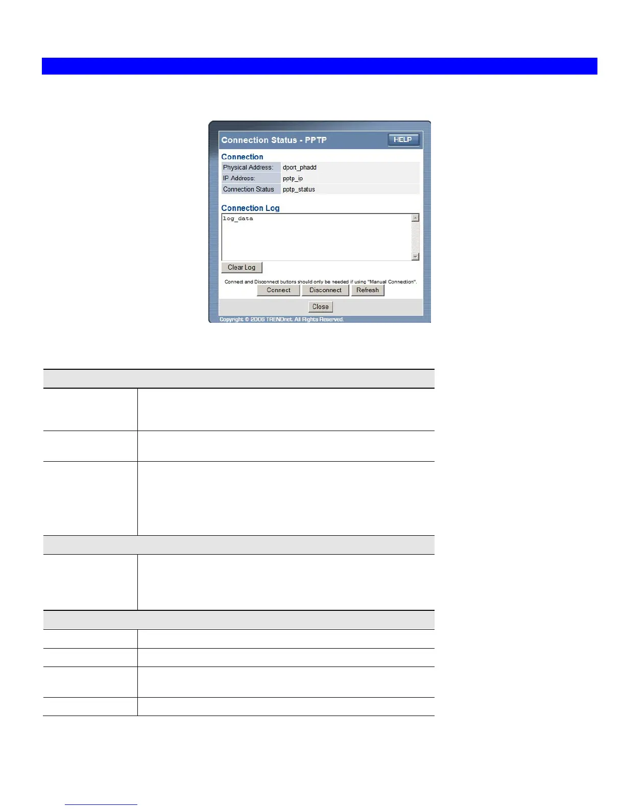 If using PPTP (Peer-to-Peer Tunneling Protocol), a screen like the following example will be displayed when the "Connection De-