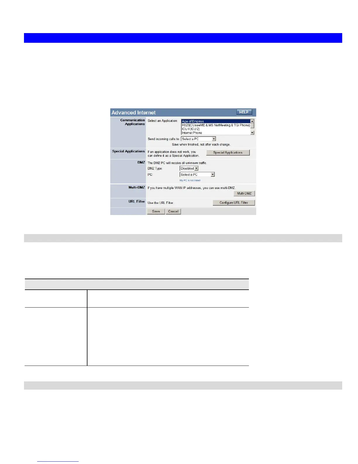 This screen allows configuration of all advanced features relating to Internet access.