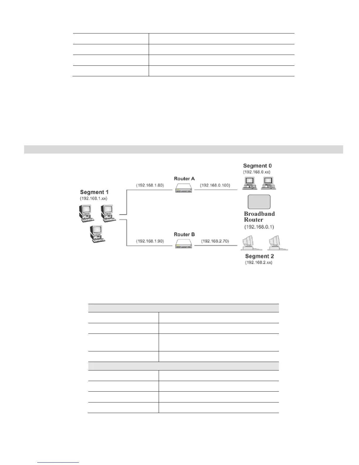 For the LAN shown above, with 2 routers and 3 LAN segments, the Broadband Router requires 2 entries as follows.