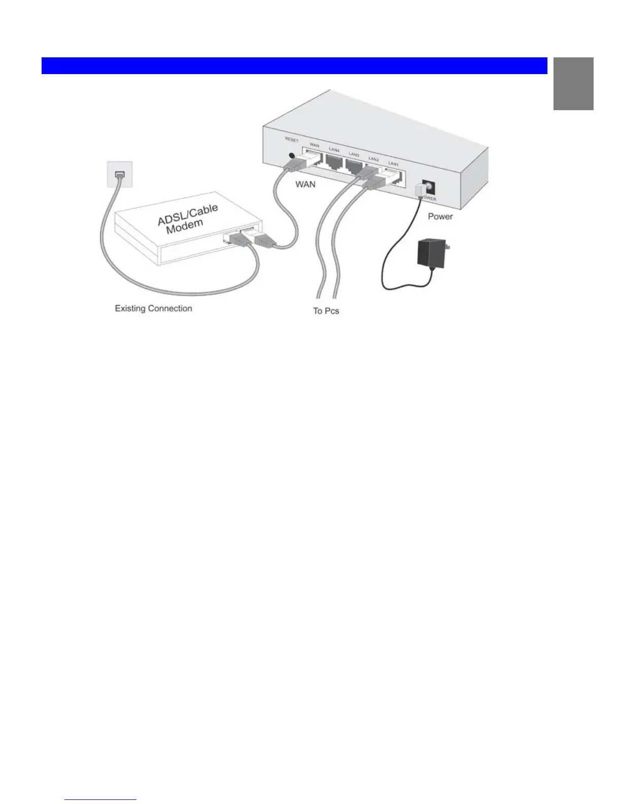 • Connect the supplied power adapter to the Broadband Router and power up.
